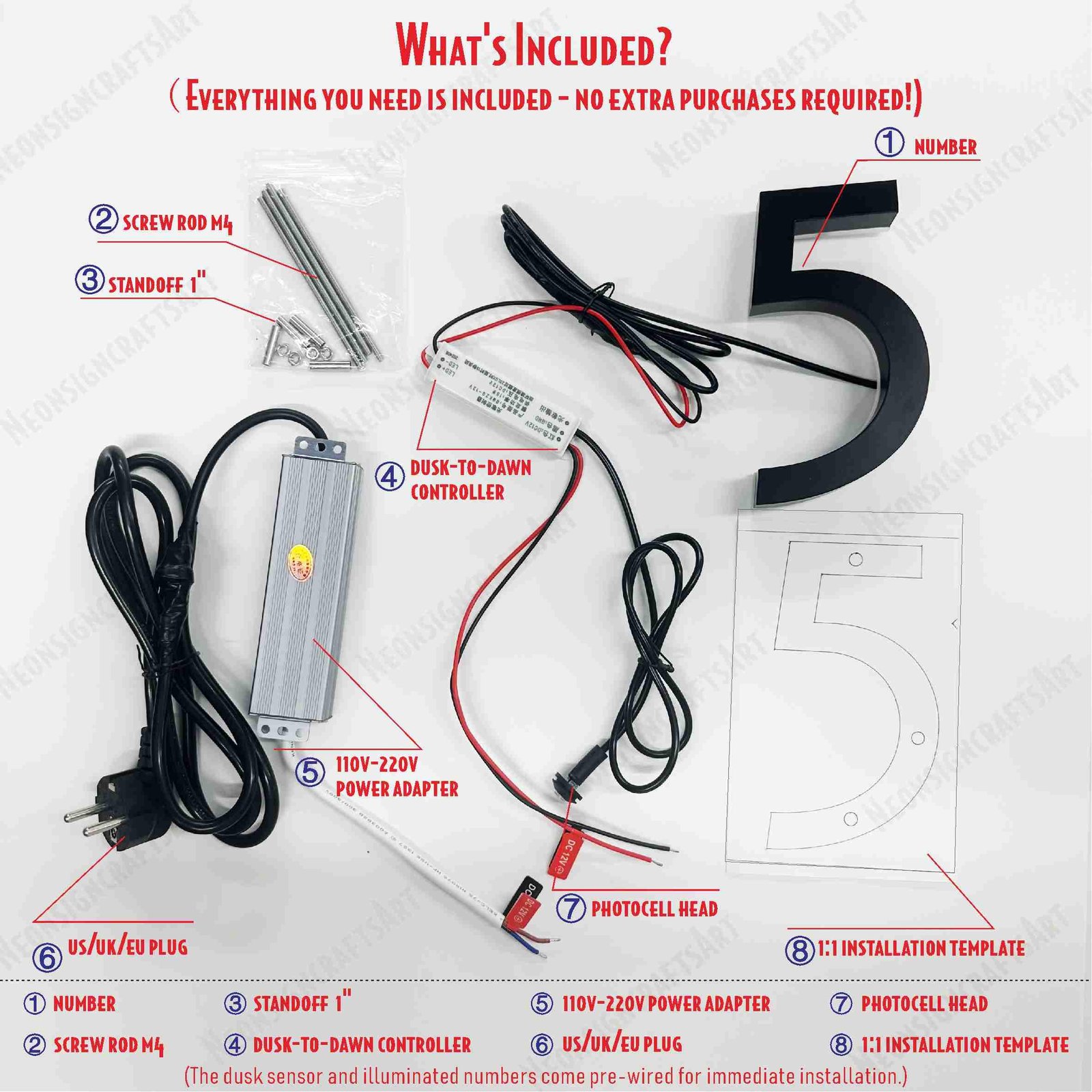 - Customization: Digits, Font, Finish, LED lighting (optional)
